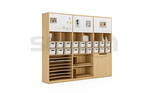SEEWIN詩敏教學設備米亞系列美術教室美術柜多層次、多類別的美術收納柜,采用環保 E0 級 MFC 板及多層板材質,可存放顏料、畫筆、畫紙等繪畫工具,分類清晰,便于拿取。上層對開門采用磁性白板設計,美觀便捷。