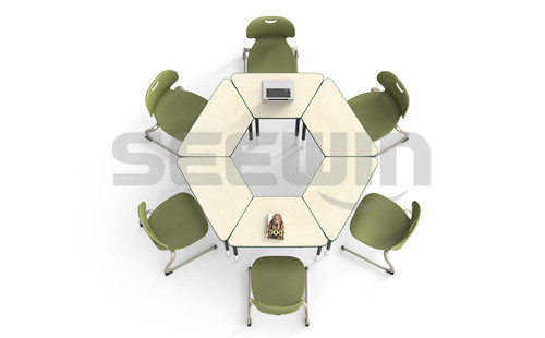 SEEWIN詩敏教學設備沃森系列智慧教室組合桌采用 E0 級 MFC 板,選材健康安全。優質鋼架焊接,堅固耐用。以小組為單位活動的課程增多,組合桌椅增加互動性,體現小組成員的團結性及個體的獨立性。獨立使用和組合使用,帶有升降功能,可根據身高調節。