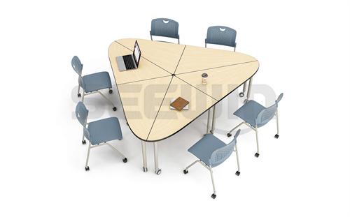 SEEWIN詩敏教學設備七巧系列人工智能教室組合桌協作式三角形拼接造型,由三個右元素和三個左元素組成。這個形狀可以讓人們在角落里組成小型團隊,確保每個使用者能夠輕松愉悅地參與協作過程。桌面可選配翻轉式,用于放置電腦,筆記本電腦的電源和數據連接都可方便地連接使用。