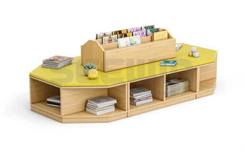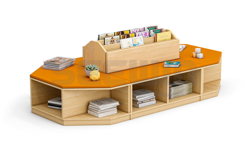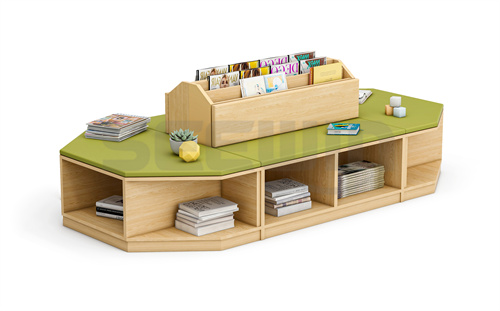SEEWIN詩敏教學設備亞特系列圖書館書柜產品采用 E0 級 MFC 板與軟包結合,綠色環保。整體多變形設計,創意造型,加強學生閱讀興趣。靠背軟包形式,適合圖書館等區域使用。